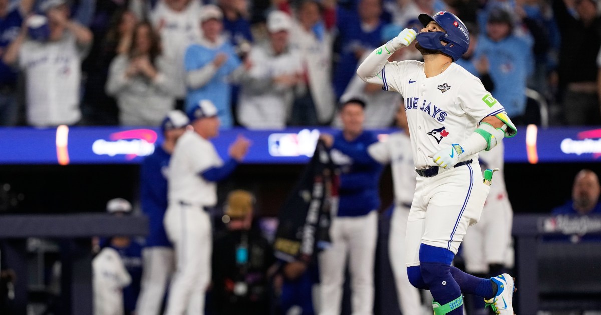 Toronto Blue Jays' Bo Bichette celebrates his three-run house run towards the Los Angeles Dodgers within the third inning of Recreation 7 of the World Sequence. Brynn Anderson / The Related Press